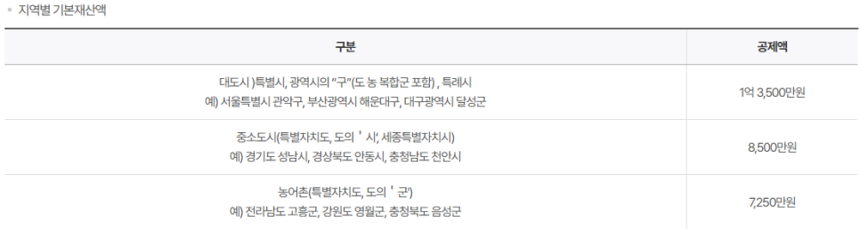 여기서 가장 중요한 것이 기본재산액 공제입니다. 지역에 따라 공제 금액이 다르게 적용됩니다.