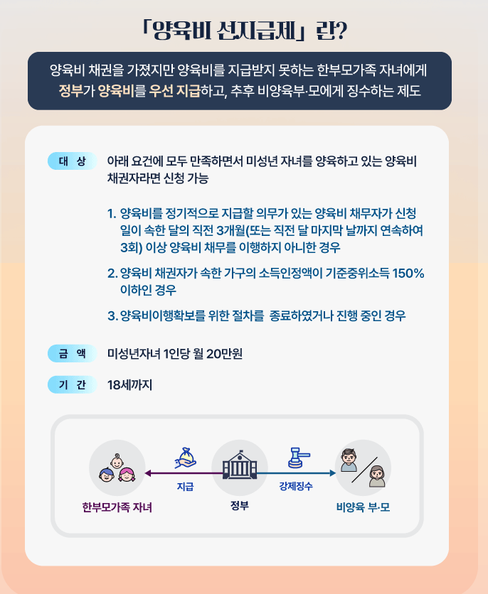 - 절차: 신청서 및 증빙서류 제출 → 소득·미지급 사실·법적 노력 등 심사 → 대상자 선정 → 자녀 1인당 월 20만 원씩 매월 지급 시작 → 만 18세(고교생 19세)까지 지급.