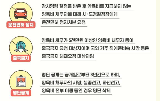 - 2025년부터는 감치명령 없이도 3회(3개월) 이상 미이행시 금융·가상자산 포함 모든 재산 즉시 강제조사 진행 가능(운전면허정지·출국금지 등 제재 강화)