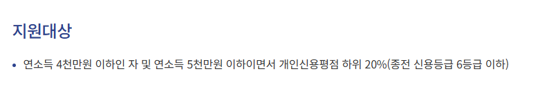 - 또는 연 소득 5,000만 원 이하이면서 신용점수 하위 20%(NICE 740점 이하, KCB 700점 이하 가이드)