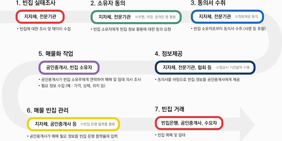 농림축산식품부는 2024년 6월부터 제주, 의령, 거창, 합천, 예천, 여수, 예산, 홍성, 충주, 옥천 등 10개 시군 빈집 소유자에게 거래 동의 요청 문자를 발송해 소유자의 참여를 유도하고 있습니다.