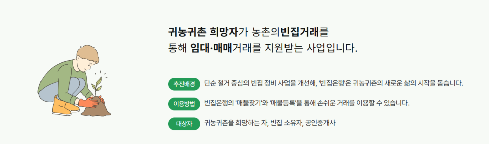 이 사업의 목적은 지자체에서 수집한 농촌 내 방치된 빈집 정보를 민간 부동산 플랫폼(한방, 디스코, 네이버 부동산 등)과 귀농귀촌 종합지원 플랫폼 ‘그린대로’에 등록해 수요자가 온라인에서 쉽고 빠르게 빈집 매물 정보를 접할 수 있도록 돕는 것입니다.