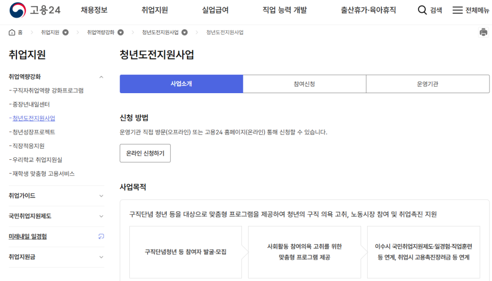 청년도전지원사업은 고용노동부 ‘고용24’ 웹사이트(https://work.go.kr)를 통해 쉽게 신청할 수 있습니다.