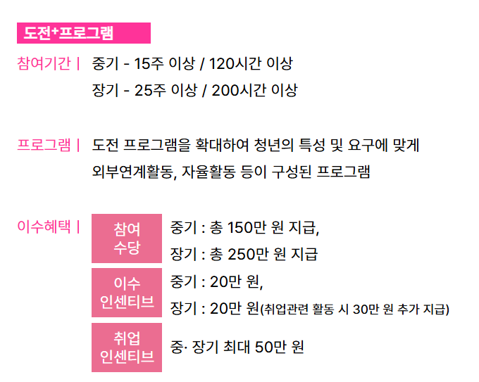• 도전+ 프로그램(장기과정): 25주 과정, 200시간, 통합 지원과 사례관리, 최대 250만 원 수당 + 이수 인센티브 20만 원, 취업 인센티브 50만 원, 구직활동 인센티브 30만 원 포함