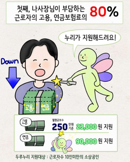 - 국민연금과 고용보험료의 약 80%를 나라가 지원해줍니다