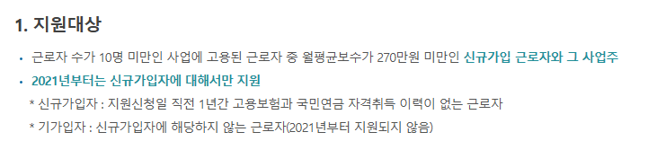 - 근로자의 월평균 보수가 ‘270만 원 미만’이며, 신청일 직전 1년간 국민연금·고용보험 신규 가입자만 해당