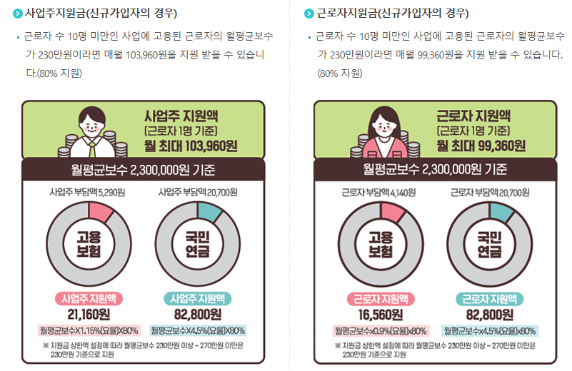 - 월평균 보수 270만 원 미만의 ‘신규 가입 근로자’ 및 사업주 모두 해당