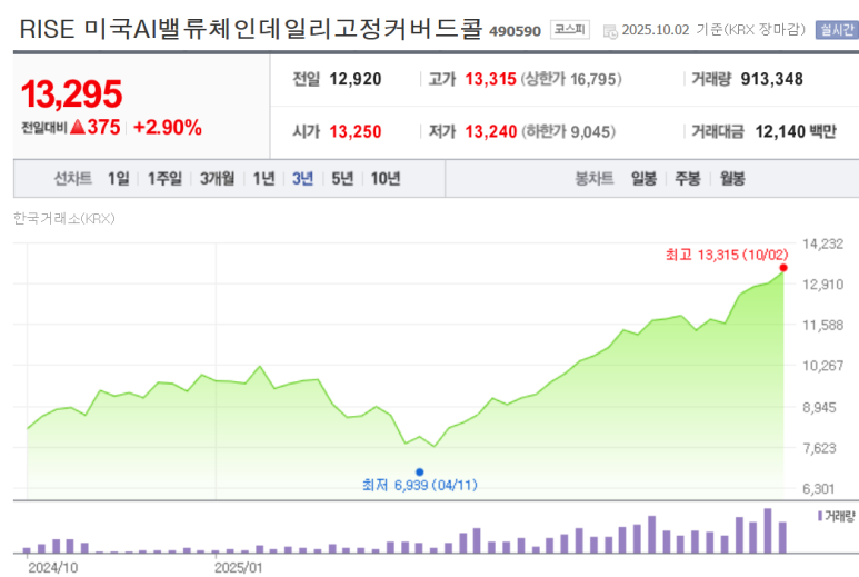 이 ETF의 주가는 2024년 10월 상장 이후 꾸준한 상승세를 보이고 있습니다. 52주 최저가 7,715원에서 최고가 13,305원까지 상승했으며, 2025년 3월 현재도 고점권에서 거래되고 있습니다.