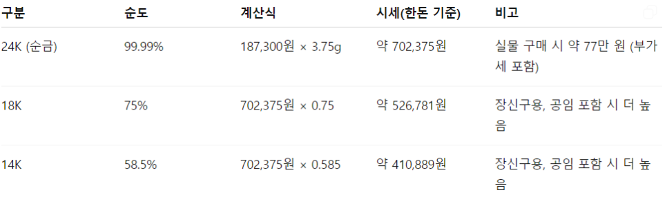 18K, 14K는 나머지가 구리·은 등 타 금속 혼합. 해당 시세는 매장/디자인/세공비에 따라 달라지며, 팔 때는 금 함량만 인정받기 때문에 실제 환급율이 크게 낮아집니다.